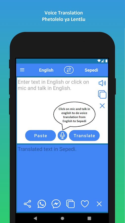 А) Нажмите кнопку «Микрофон» и произнесите текст. Когда вы закончите голосовой ввод, нажмите «Перевести», и приложение «Переводчик с английского на Сепеди» переведет текст.