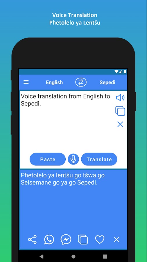 ✓ Используя встроенную технологию распознавания голоса, вы можете вводить текст голосом, а затем переводить его. Эта удобная функция позволяет переводить обычные разговоры. Вы можете перевести свой английский голос на сепеди и голос сепеди на английский.