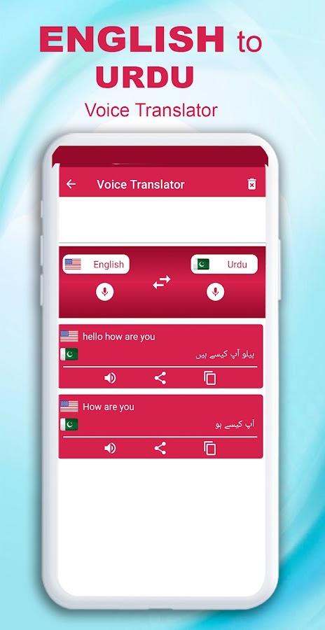 В дополнение к переводу с английского на урду и переводу с урду на английский, другой характеристикой, которую дает приложение, является словарь с английского на урду и словарь с урду на английский. Эта функция словаря урду приложения позволяет вам открывать английские значения фраз урду. Кроме того, функция английского словаря приложения позволяет вам находить значения урду английских фраз. следовательно, с помощью этой функции вы можете найти английские значения фраз урду и таким же образом значения урду английских слов.
