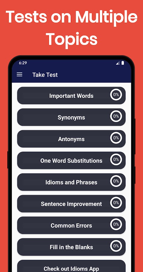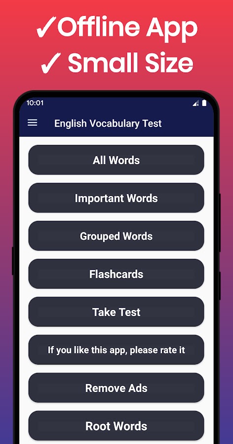 Приложение English Vocabulary Test поможет вам выучить английский словарь эффективным способом. Vocabulary Builder — это автономное приложение, в котором вы можете изучать английские слова без подключения к Интернету.