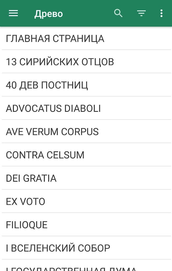 Официальная офлайн-версия открытой православной энциклопедии «Древо» (https://drevo-info.ru), содержит более 31 тыс. статей и 19 тыс. иллюстраций, в том числе:
