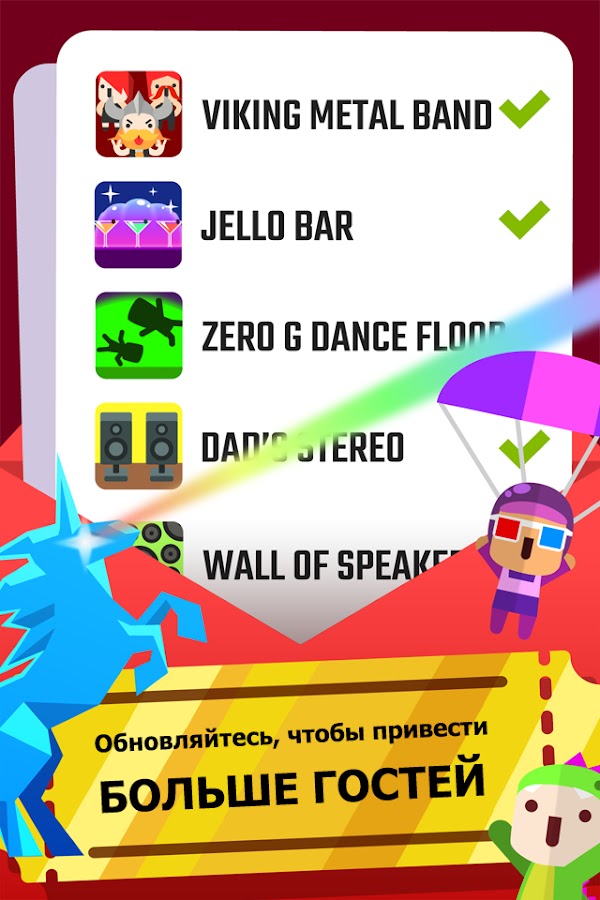 • Получите более 20 усовершенствований вечеринки, чтобы свести ваших гостей с ума: аркады, лазерные ледяные скульптуры, лунный фильтр и даже машина времени, которая принесет на ваш праздник элементы вечеринок разных эпох. Потрясающе!