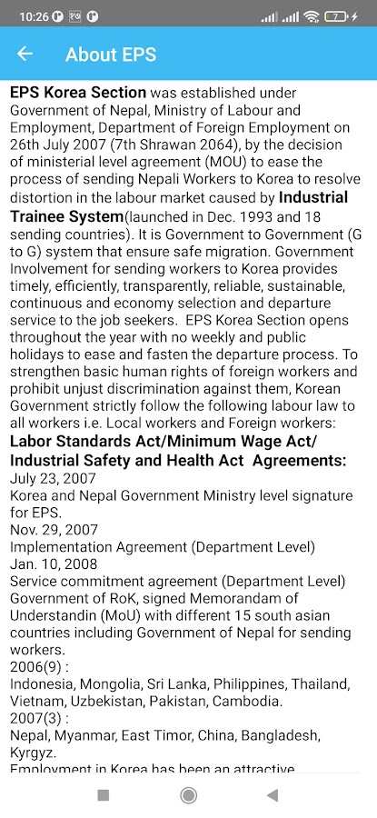 Корейская секция EPS была создана при правительстве Непала, Министерстве труда и занятости, Департаменте по трудоустройству за рубежом 26 июля 2007 г. (7-й Шраван 2064 г.) решением соглашения на уровне министров (МОВ) для облегчения процесса отправки непальских рабочих в Корею. для устранения перекосов на рынке труда, вызванных Системой промышленного обучения (запущена в декабре 1993 г. в 18 странах-отправителях). Именно межправительственная система (G to G) обеспечивает безопасную миграцию. Участие правительства в отправке работников в Корею обеспечивает своевременный, эффективный, прозрачный, надежный, устойчивый, непрерывный и экономичный отбор и выезд соискателей.