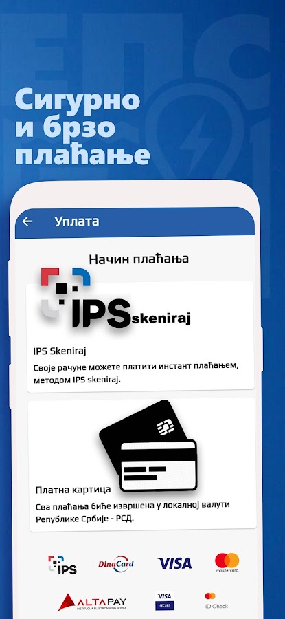 С мобильным приложением доступна безопасная и быстрая электронная оплата счетов без посещения отделений платежных организаций. Оплатить счета можно с помощью системы моментальных платежей IPS Scaniraj и платежных карт Dina, Visa и MasterCard.