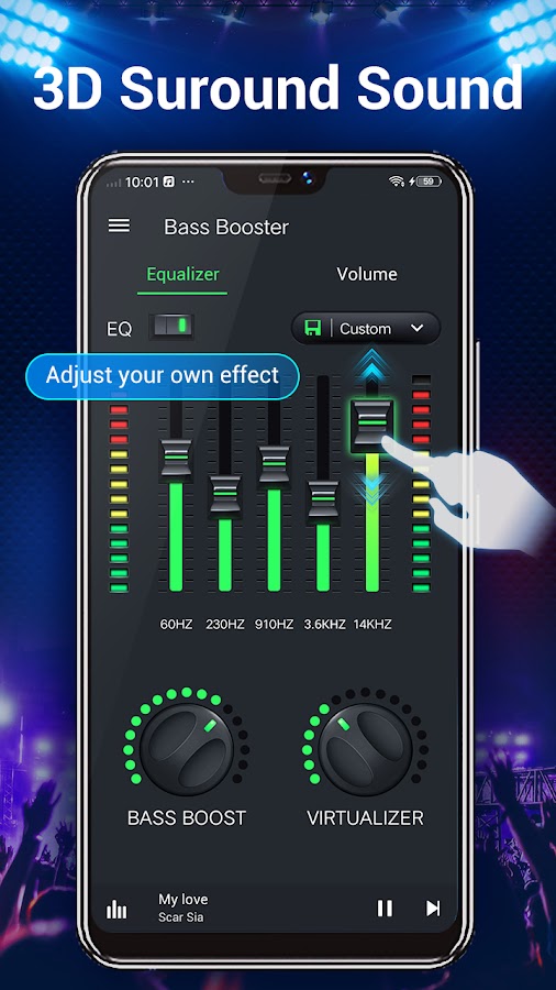 Bass Booster позволяет настраивать уровни звуковых эффектов, чтобы вы могли получить максимальную отдачу от музыки или звука, воспроизводимого с телефона. Virtualizer, создающий медиафайлы, производит качественный звук с поддержкой Digital Surround!