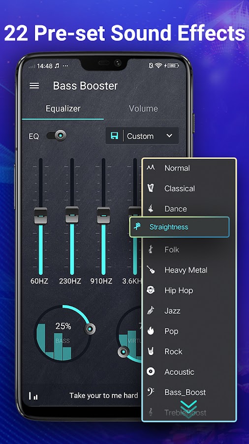 Музыкальный эквалайзер с лучшими пятиполосными эффектами эквалайзера, усиления басов и виртуализатора. Просто сделайте так, чтобы ваш музыкальный проигрыватель обладал потрясающими звуковыми эффектами и никогда не был таким профессиональным. БЕСПЛАТНО загрузите этот фантастический музыкальный эквалайзер и получите лучшее музыкальное наслаждение!