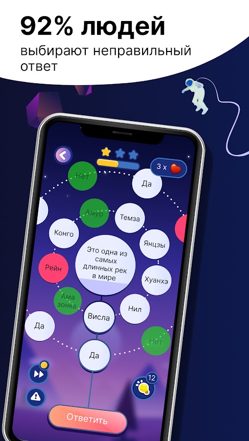 Приложение дает вам три попытки, так что не волнуйтесь, если ответили неверно — все поправимо.