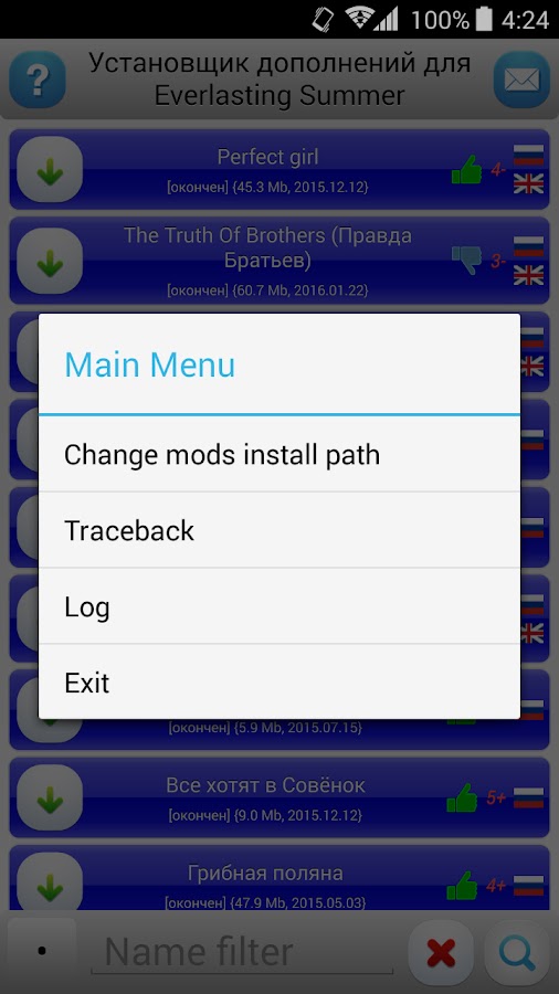 Загрузчик предоставляет пользователю интерфейс для удобного доступа к каталогу дополнений, фильтров и модификаций визуальной новеллы «Бесконечное Лето». Дополнения, содержащиеся в каталоге, адаптированы для платформ Android и iOS, и прошли проверку на работоспособность.