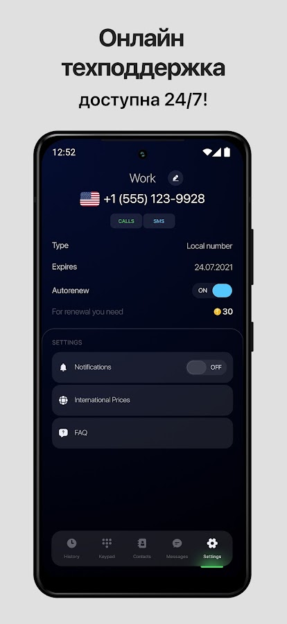 – Виртуальные номера: добавьте виртуальный номер для звонков и SMS — оставайтесь на связи в США, Канаде, Великобритании и других странах.