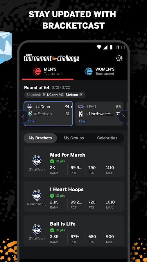 — В каждой игре (мужской, женский, «Второй шанс» для мужчин и «Второй шанс» для женщин) создайте до 25 сеток и разместите каждую в 10 разных группах, чтобы соревноваться с друзьями, знаменитостями, ведущими ESPN и болельщиками со всей страны.
