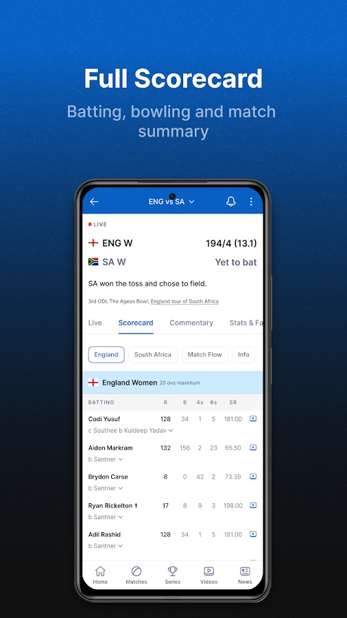 Откройте для себя большую часть контента ESPNcricinfo в приложении. Широчайший охват крикетом во всем мире, включая IPL, PSL, BPL, BBL, CPL, Чемпионат мира по крикету ICC, Чемпионат графства, Ranji Trophy, Sheffield Shield.