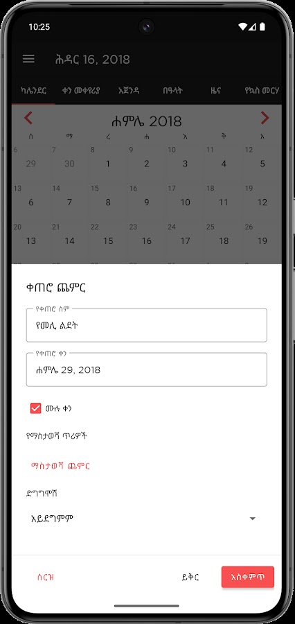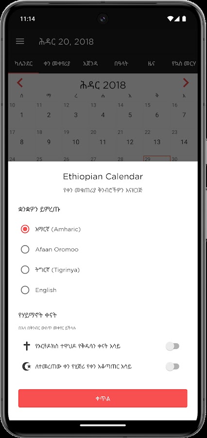 — Расширенный календарь праздников — никогда не пропустите важные праздники благодаря автоматической отметке дней святых эфиопской православной церкви, национальных праздников и дат исламского/хиджрийского календаря. Идеально подходит для отслеживания постов и религиозных обрядов.