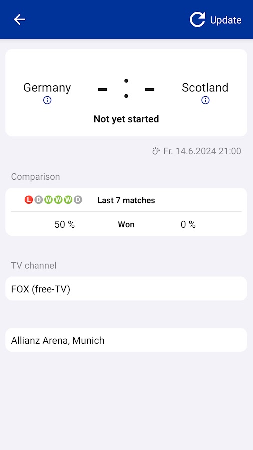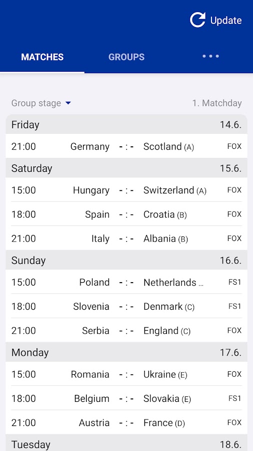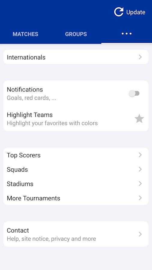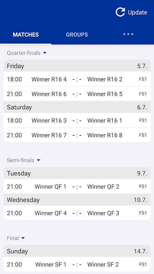 Все результаты и результаты в реальном времени. Приложение включает в себя всю турнирную таблицу, группы, таблицы, стадионы, бомбардиров, квалификационные матчи и составы кубка. Также есть (опционально) быстрые уведомления о голах и красных карточках. Выделите цветом свои любимые команды (например, США).