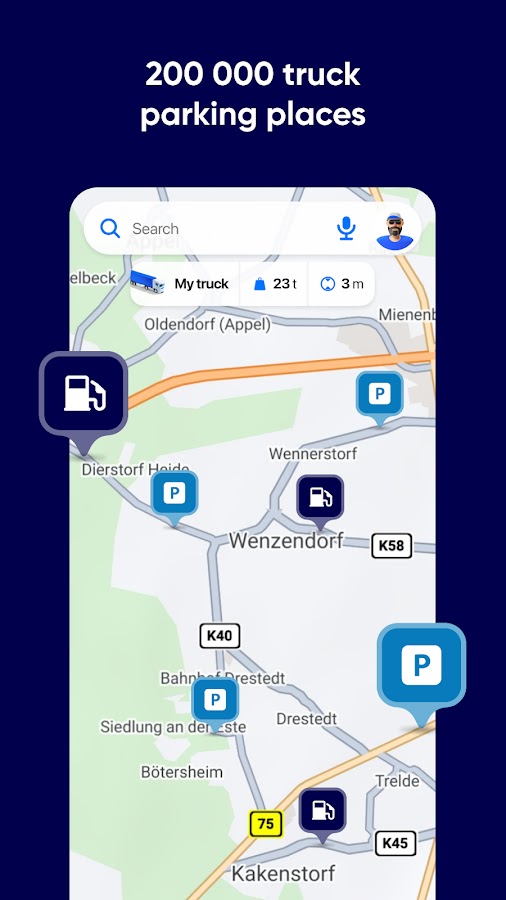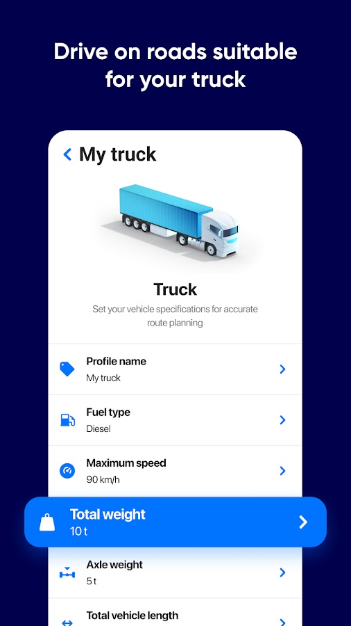 ◦ Введите рост / вес / длину / ось и другую информацию, настройте до 2 профилей грузовиков, получите маршрут грузового автомобиля для различных транспортных средств и избегайте дорог, не подходящих для вашего грузовика и груза