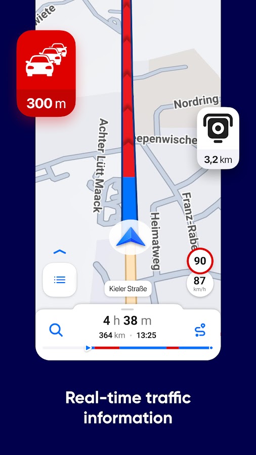 ◦ Эта спутниковая навигация также предоставляет информацию о дорожном движении в реальном времени, полицейских патрулях, предупреждения об ограничении скорости и камерах контроля скорости, динамический помощник по полосе движения и многое другое.