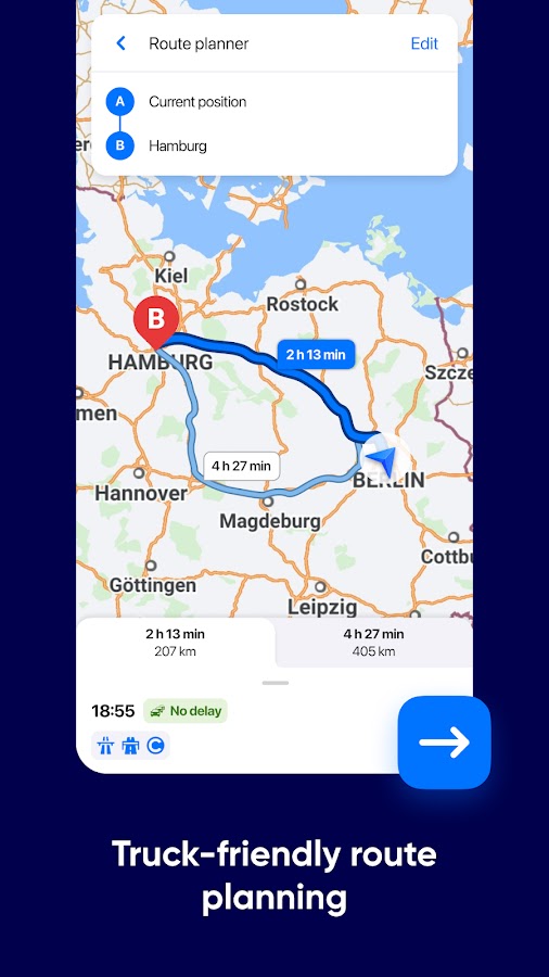 Eurowag Navigation — Truck GPS — это бесплатное онлайн-приложение для навигации с картами более 40 стран Европы. Эта спутниковая навигация предназначена для выбора наилучшего маршрута для вашего грузовика, фургона или другого типа крупного транспортного средства. На основе дорожных предпочтений он подбирает для вашего грузовика полностью спроектированные маршруты. Навигация для грузовых автомобилей также предоставляет информацию о дорожном движении в реальном времени, например об инцидентах, а также информирует водителей грузовиков о полицейском контроле, камерах контроля скорости и многом другом. Найдите подходящие заправочные станции или стоянки для грузовиков вдоль маршрута. Сохраняйте места и маршруты в избранное.
