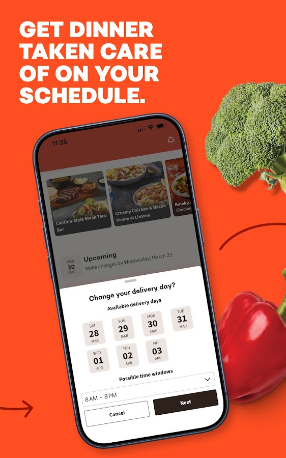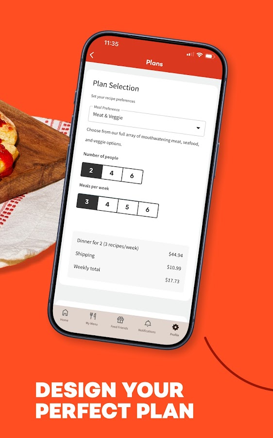 Управляйте своим планом питания: пропустите неделю или приостановите свой план питания в любое время. Измените количество рецептов, которые вы получаете, или управляйте настройками меню. Изменить настройки доставки и оплаты.