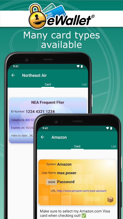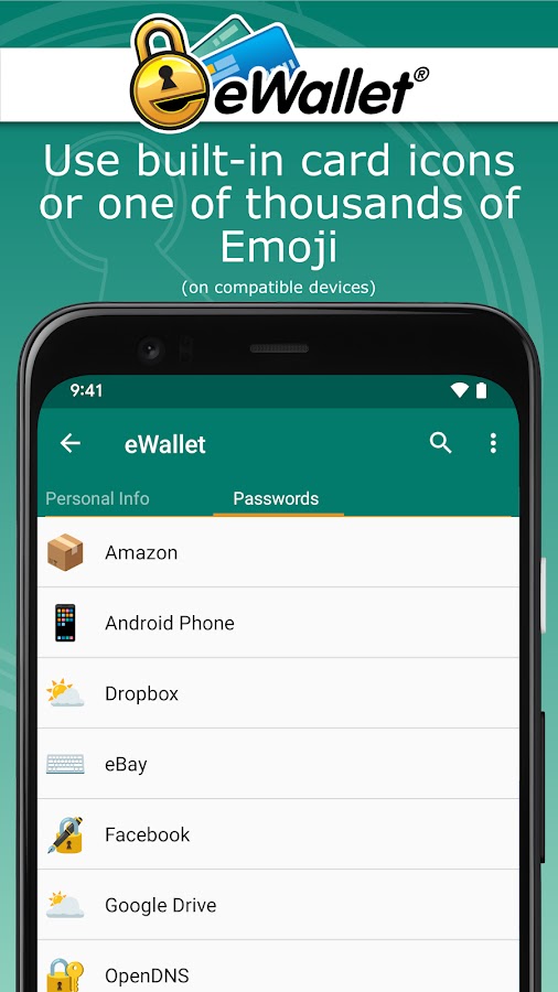 Заблокируйте свои пароли, номера кредитных карт и банковских счетов с помощью шифрования военного уровня и носите их с собой куда угодно, установив самое сложное и простое в использовании приложение-менеджер паролей на свой смартфон и планшет Android. Оставайтесь в безопасности, оставайтесь сильными, оставайтесь умными и организованными с помощью мощного приложения для смартфонов и планшетов eWallet®.