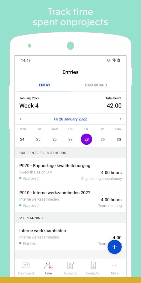 Анализ ваших финансовых показателей или дебиторской задолженности в режиме реального времени в любое время и в любом месте? Быстро отсканировать счет или квитанцию и добавить ее в свой учет? Легко отслеживать время, затрачиваемое на проекты, просматривать платежную ведомость или запрашивать личный отпуск? С Exact Online App у вас есть доступ в режиме реального времени к наиболее важным финансовым данным из вашего бухгалтерского учета. Инструменты, встроенные в приложение, помогут вам работать эффективнее.