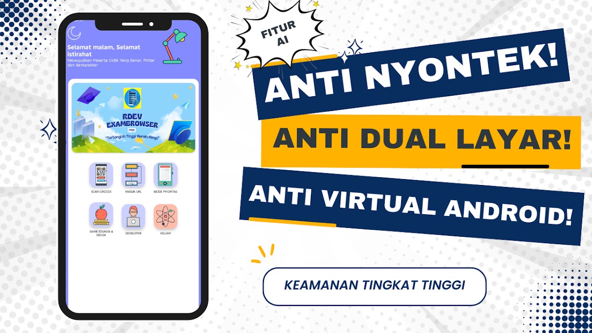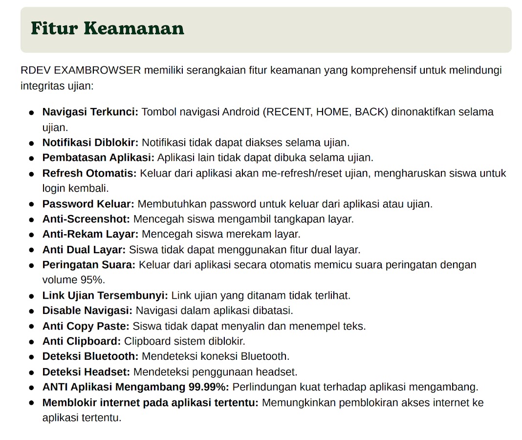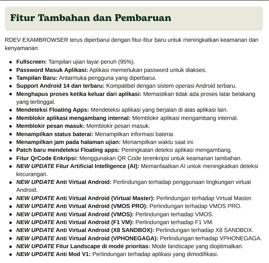 Для школ, которые хотят, чтобы приложение Exambrowser использовало дизайн школы, логотип школы, название школы и версию 9.5 PREMIUM, свяжитесь с WhatsApp/Telegram по номеру 082211576796. Или на официальном сайте https://r-developer.my.id.