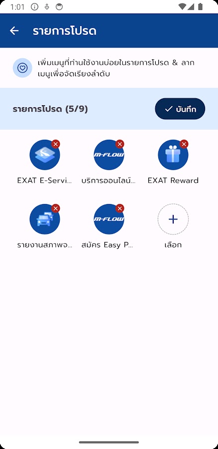 Услуги: включая различные услуги, которые Управление скоростных автомагистралей Таиланда предоставляет пользователям. Это центр для вызова других приложений Управления скоростных автомагистралей Таиланда. Онлайн-сервис для клиентов Easy Pass и подтверждение привязки карты Easy Pass к использованию M-Flow.