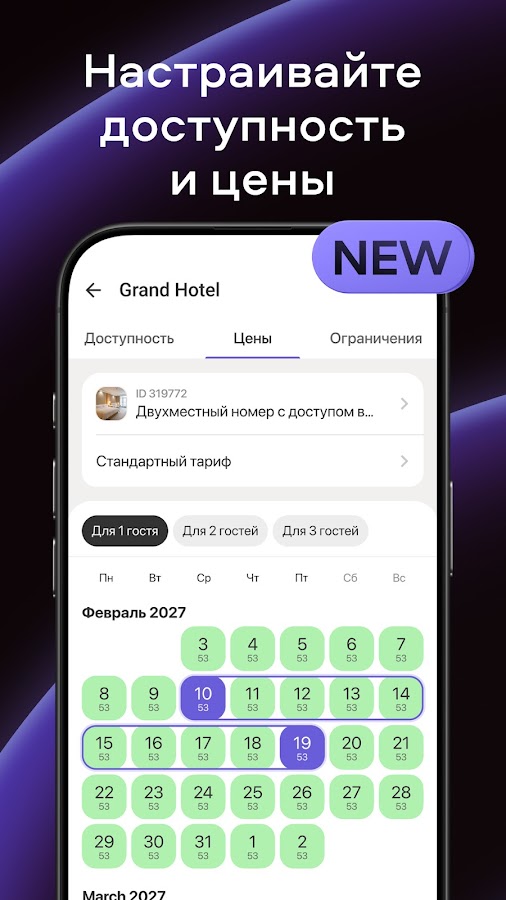 В календаре можно просматривать и редактировать число открытых для продажи номеров и стоимость размещения, устанавливать и снимать ограничения.