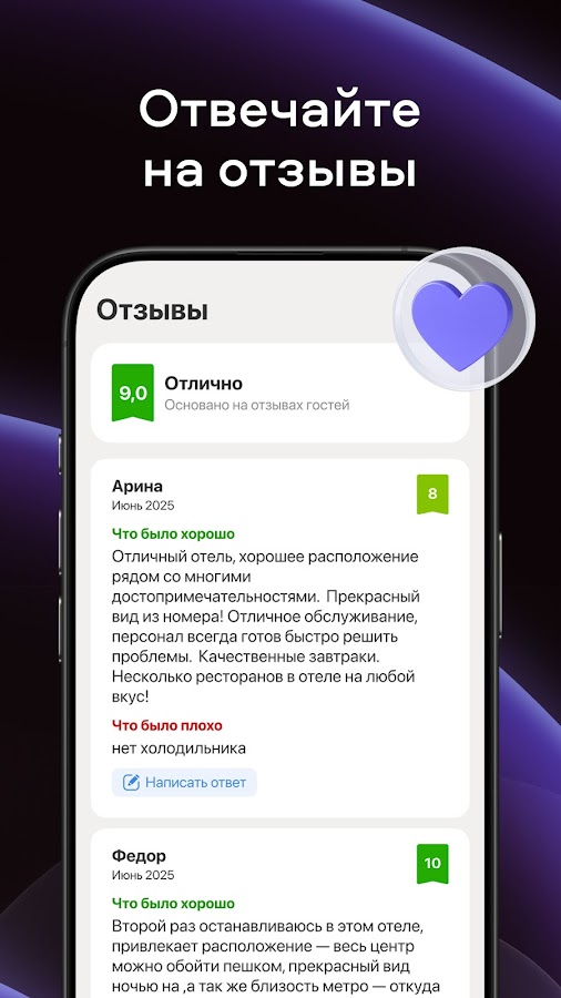 Благодаря приложению вы будете оперативно узнавать о новых бронированиях, отменах и сообщениях от гостей. Мы также отправляем напоминания о предстоящих заездах, чтобы вы заранее могли проверить все детали.