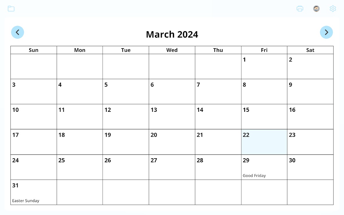 EZ Calendar Maker — это бесплатная удобная утилита для создания и печати аккуратных календарей с любого устройства. Она максимально проста в использовании. Вы можете выбрать месяц для печати и настроить календарь, например, добавив фоновое изображение. Затем просто нажмите «Печать», и ваш принтер выдаст готовый календарь! Бесплатный и простой в использовании, EZ Calendar Maker, несомненно, лучше, чем ежегодно покупать новый календарь в магазине.