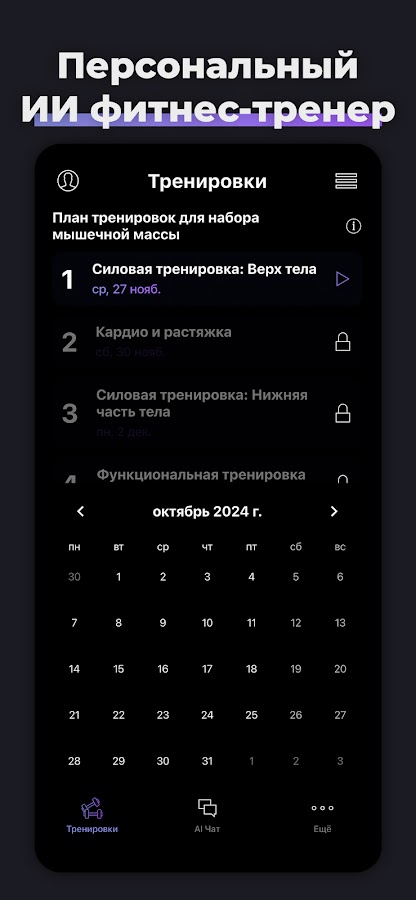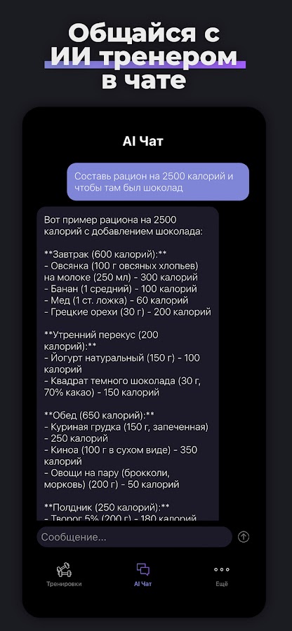 * Чат с ИИ-тренером: Задавай вопросы прямо в приложении, и искусственный интеллект подскажет тебе всё, что нужно – от техники выполнения до питания. (Ограниченный доступ бесплатно; полный доступ открывается через подписку.)