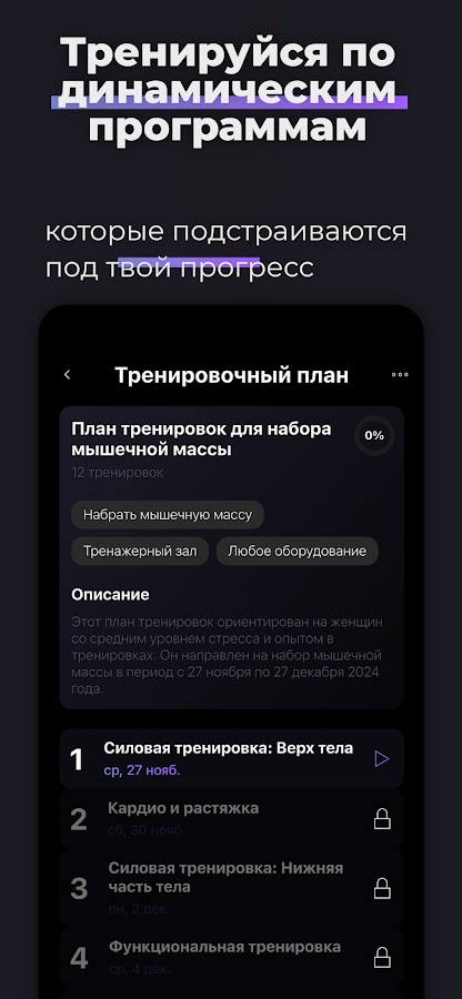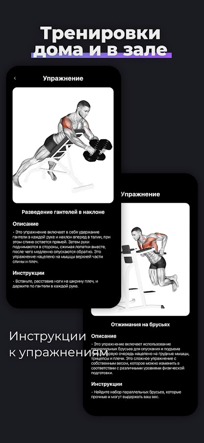 * Визуализации упражнений: Подробные анимации техники выполнения каждого упражнения помогут избежать ошибок и сделать тренировки безопаснее и эффективнее.