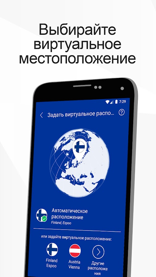 Встречайте новое поколение средств цифровой конфиденциальности и безопасности! Используйте интуитивный интерфейс, в котором для выполнения задачи достаточно нажать всего одну кнопку — всегда оставайтесь на шаг впереди злоумышленников и шпионов и с легкостью обеспечивайте защиту своего устройства из выбранного безопасного виртуального местоположения.