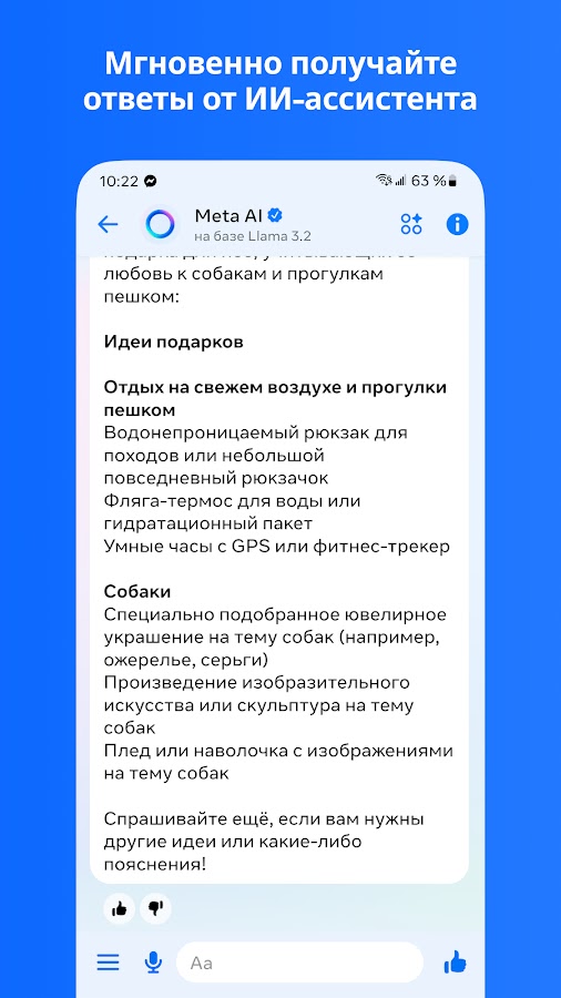 Meta AI — это ваш помощник, который поможет найти ответ на вопрос, поделится советом, подскажет с домашним заданием и т. д.