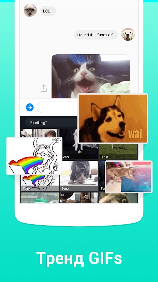 -Развитие Gifs: поиск любых слов и получение многочисленных трендов Gifs для обмена с друзьями.