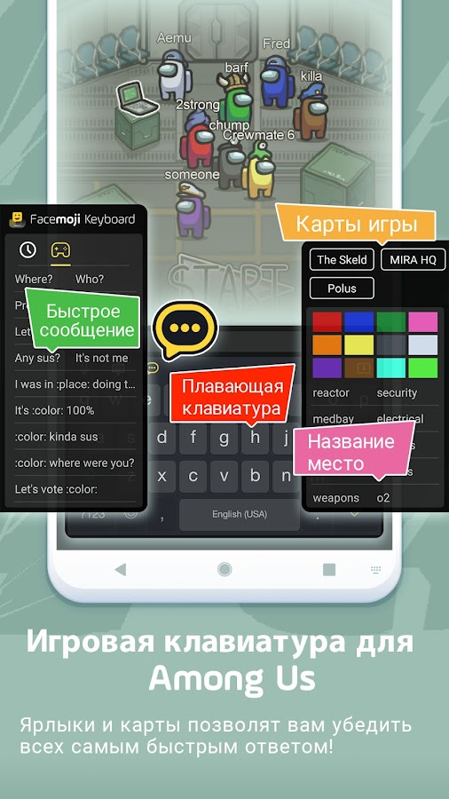 Мы создали специальную клавиатуру для Among us!!! Вы можете легко ВЫИГРАТЬ в каждой игре одним нажатием на быстрое сообщение, цвет игрока и его местоположение на нашей клавиатуре Among us! Наш игровой режим также поддерживает Roblox, Free Fire, PUBG, Mobile legends и т. Д.