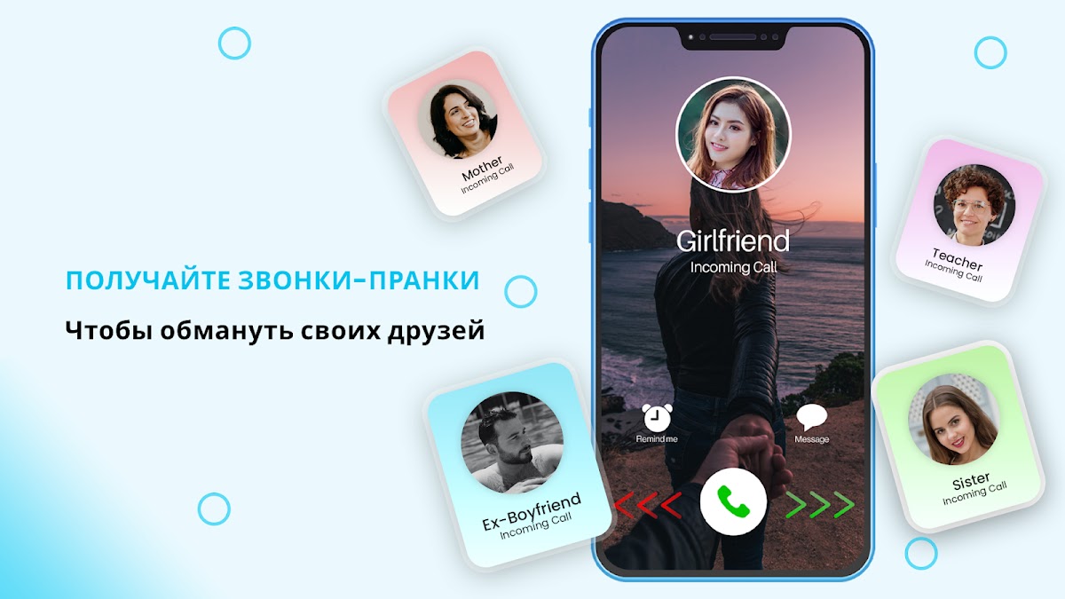 Приложение «Ложные звонки» — это инструмент, который поможет вам выйти из любой неловкой встречи, бессмысленного разговора или нежелательной ситуации с помощью розыгрыша. С помощью приложения для розыгрыша вы можете установить фальшивый звонок, выбрав, кого вы хотите выбрать в качестве персонажа, то есть мать, отец, друг, парень или подруга. Вам решать, кому вы хотите сделать ложный звонок! Приложение для розыгрыша поддельного звонка предоставляет удобный интерфейс для поддельного звонка и дает вам возможность принимать розыгрыши по телефону.