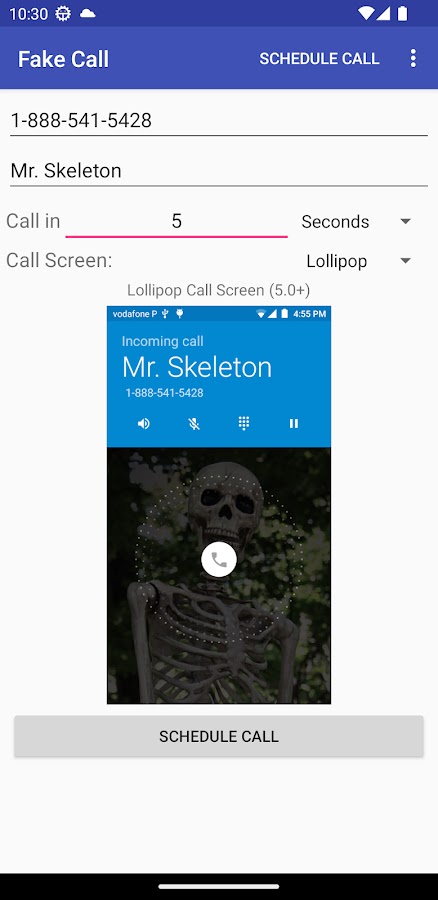 Запустите приложение и введите имя вызывающего абонента, номер и задержка времени вы хотите иметь для вызова, а затем нажмите Запланировать вызов. Если вы передумаете, вы можете отменить вызов с помощью кнопки сброса вызова в любое время, даже если вы закрыли приложение с тех пор.