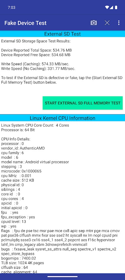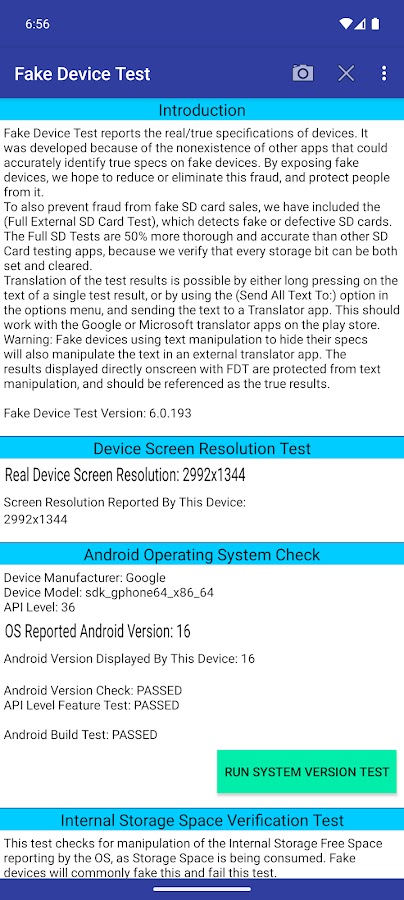 Fake Device Test было первым и, возможно, до сих пор единственным приложением, которое фокусируется на выявлении поддельных характеристик устройств и пытается предотвратить мошенничество в отношении наших пользователей. Если продавец не гарантирует, что его устройство будет работать (Fake Device Test), то он, скорее всего, продает поддельные устройства. Настаивайте на возможности установить и запустить (Fake Device Test) перед покупкой или принятием любого устройства. Требуйте полного возврата средств, если установка или выполнение (Fake Device Test) заблокированы.