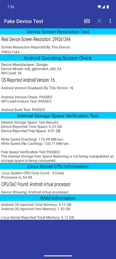 В отличие от других приложений, которые полагаются на легко подделываемую системную информацию, Fake Device Test проводит тщательные тесты для определения реальных характеристик. Это позволяет нам выявлять несоответствия и обнаруживать поддельные устройства, которые пытаются вас обмануть.