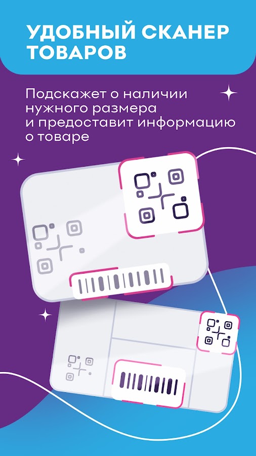Сканер товара в приложении поможет получить информацию о наличии нужного размера. Достаточно отсканировать этикетку, выбрать интересующий магазин и на экране появится карточка товара.