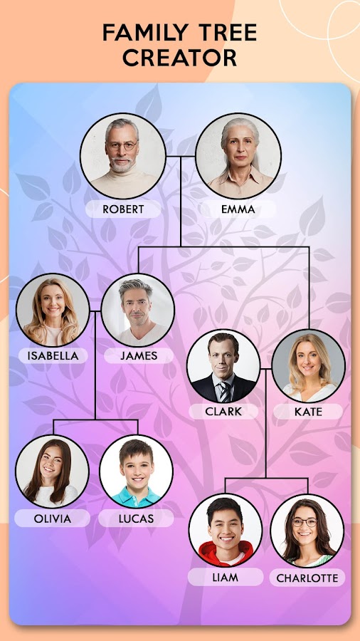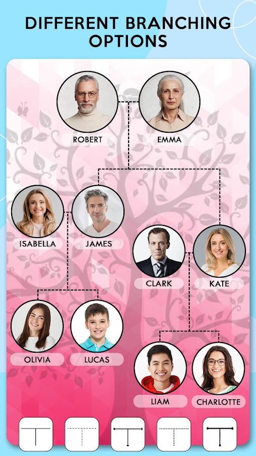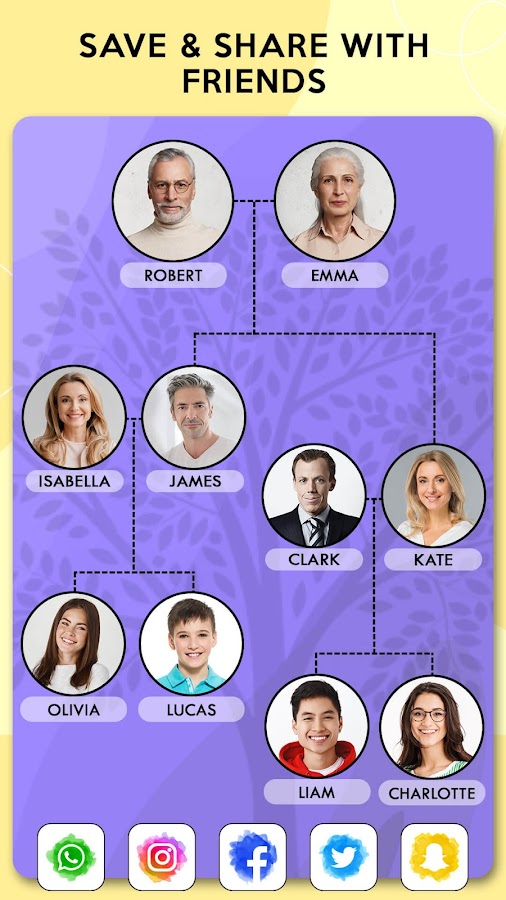 Приложение создателя семейного древа позволяет создавать родословную, которая показывает членов семьи на протяжении многих поколений и их отношение друг к другу с фотографиями. Этот создатель фотосемейного дерева объединяет обычные фотографии в сказочную родословную и создает генеалогическую карту, которая показывает отношения ваших предков и потомков.