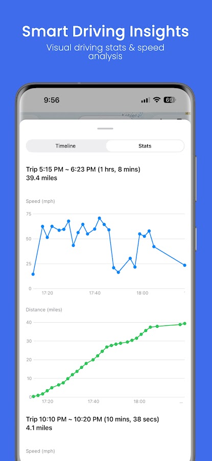 • Экспорт полной истории местоположений в формате PDF, включая графики скорости и расстояния