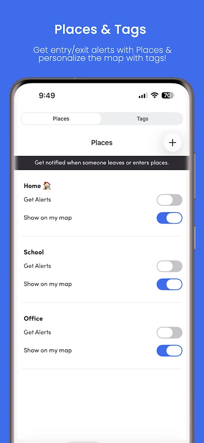 • Получение оповещений о входе/выходе, когда ребенок входит в безопасные зоны или покидает их
