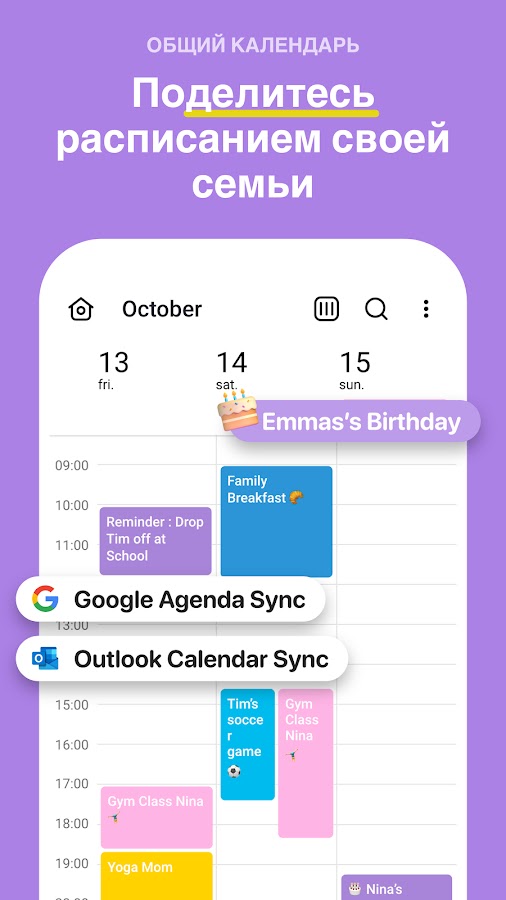 • Используйте цветной календарь для просмотра расписания отдельного человека или всей семьи одновременно.
