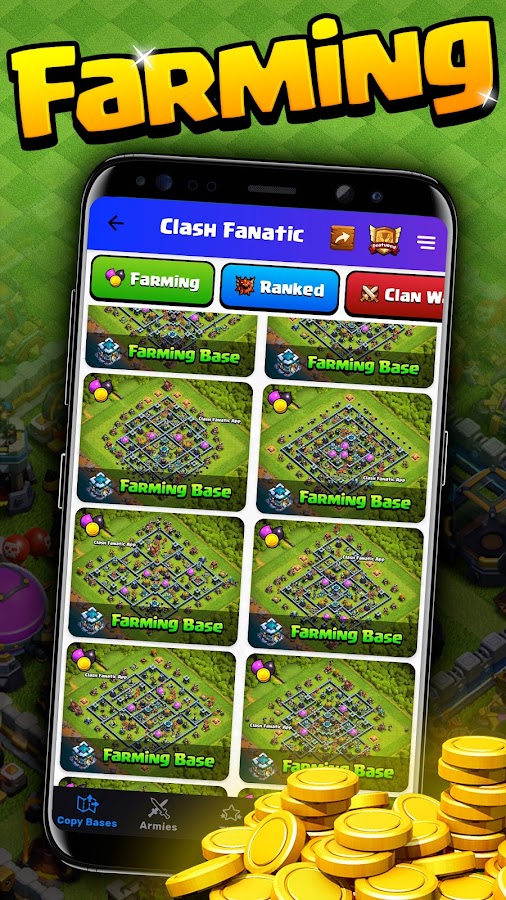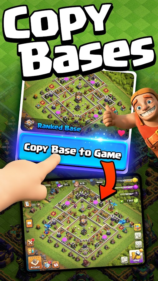 ● Базы для вашей Ратуши: — Скопируйте планировку базы с Ратуши 4 по Ратушу 17! Базы включают в себя: «Фермерство», «Ранговые бои», «Война кланов/Трофеи», «Художественная/Забавная» и «Прогресс».