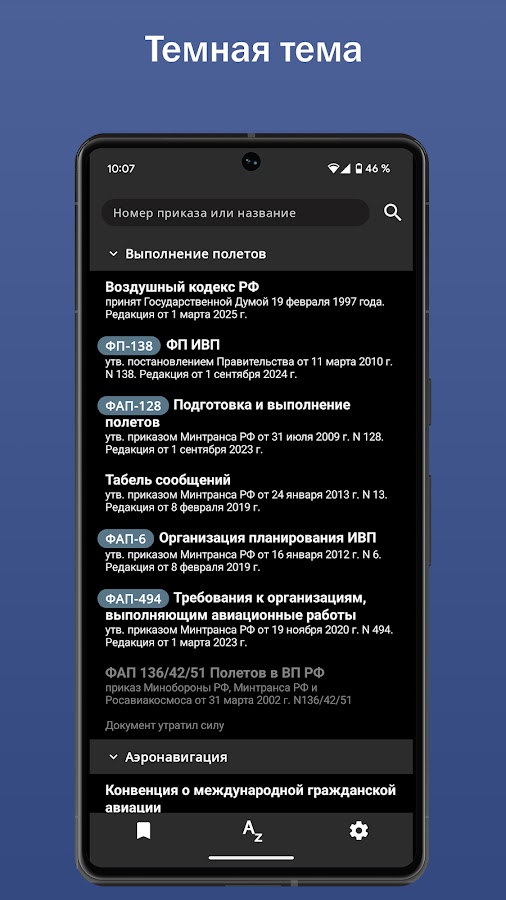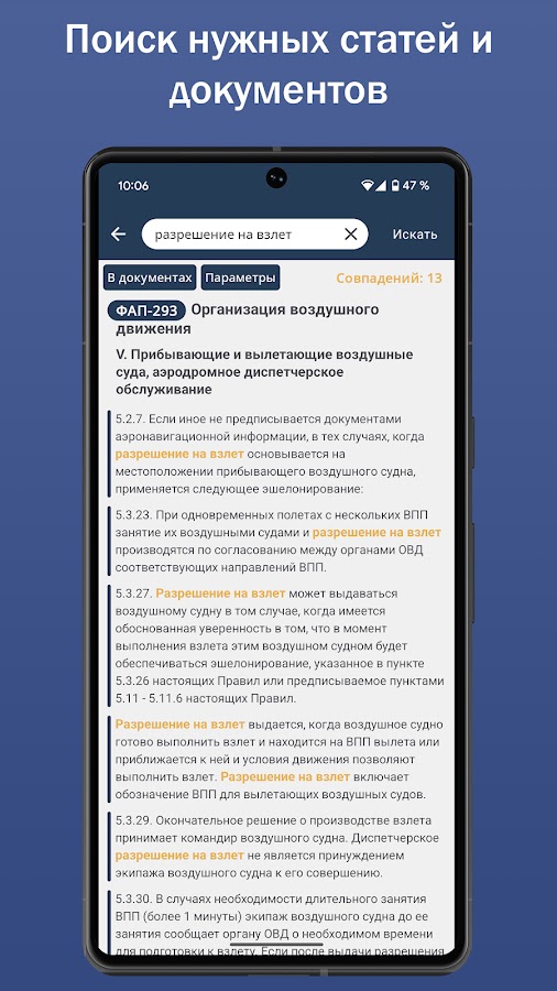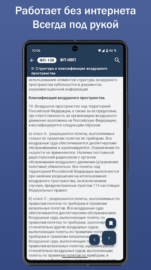 Сборник федеральных авиационных правил РФ содержит основную документацию воздушного законодательства Российской Федерации, имеет приятный интерфейс и удобную навигацию. Поиск слов в отдельной части документа, во всем документе, а также во всех документах позволит с легкостью найти нужный раздел нужного документа.