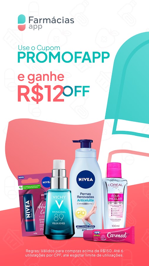 Получите скидку 15 R$ при покупках свыше 150 R$, 20 R$ при покупках свыше 200 R$ или 30 R$ при покупках свыше 300 R$. Это прекрасная возможность пополнить запасы лекарств, витаминов, средств гигиены, косметики и товаров для ежедневного ухода, заплатив меньше. Приложение Farmácias объединяет ваши любимые аптеки в полностью онлайн-формате, чтобы вы могли покупать лекарства, добавки, витамины, косметику, парфюмерию и товары для красоты с удобством, безопасностью и доступными ценами. С помощью приложения вы найдете все необходимое для вашего здоровья и ухода за собой в одном месте, просто и быстро.