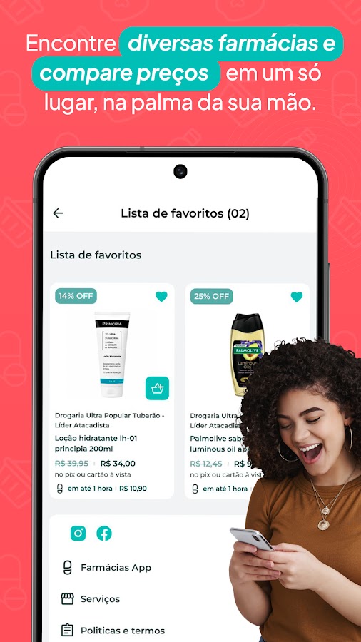 Здесь вы можете сравнить цены между партнерскими аптеками и магазинами, выбрать лучший вариант для вашего региона и получить свои товары с быстрой доставкой или забрать их в магазине. Приложение Farmácias объединяет аптеки, Парфюмерия и косметика в безопасной цифровой среде — идеально для тех, кто ищет экономию, удобство и разнообразие.