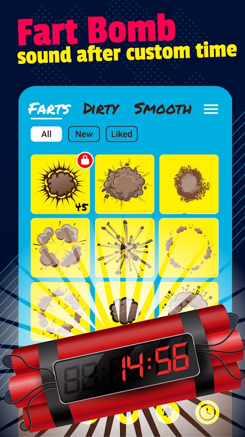 Лучшая шутка с пердежом с друзьями или кем-либо, у кого в кармане есть телефон Android. Вы можете установить таймер пердежа, также выбрав звук, и тайно поместить его за стул друга или сидячее место. Фарт взорвется после установленного вами таймера, и забавная ситуация превратится в веселые смеющиеся лица. Кнопка Fart также предназначена для воспроизведения внезапных звуков любого типа пердежа для развлечения. Быстрое воспроизведение пукающего звука шокирует любого, кто удивлённо взглянет друг на друга.