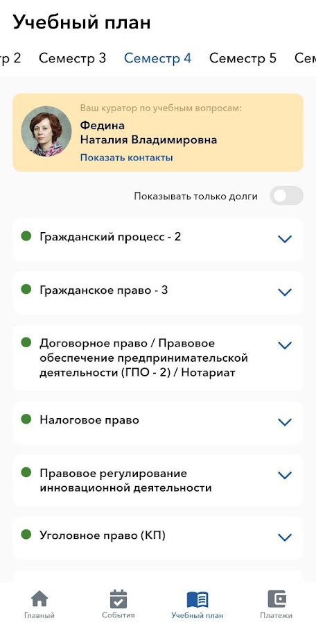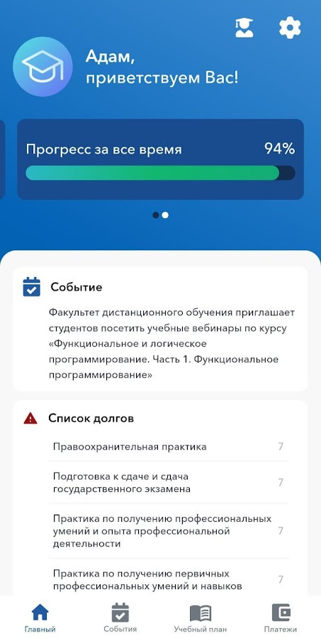 — в разделе «Платежи» знакомиться с графиком платежей за обучение, видеть историю своих платежей, а также производить оплату в самом приложении.