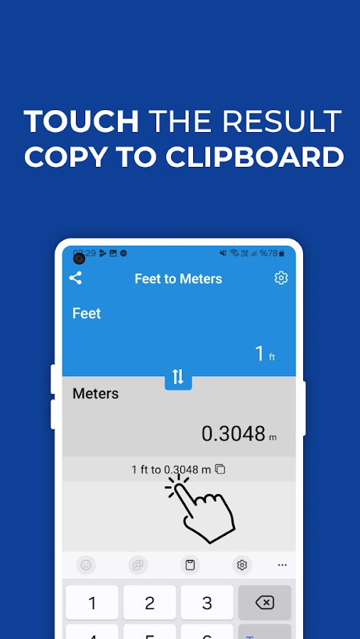 — Коснитесь поля ввода метров, введите число и конвертируйте в футы